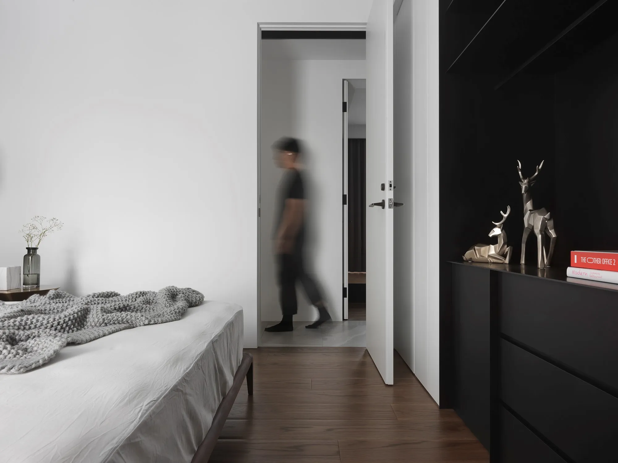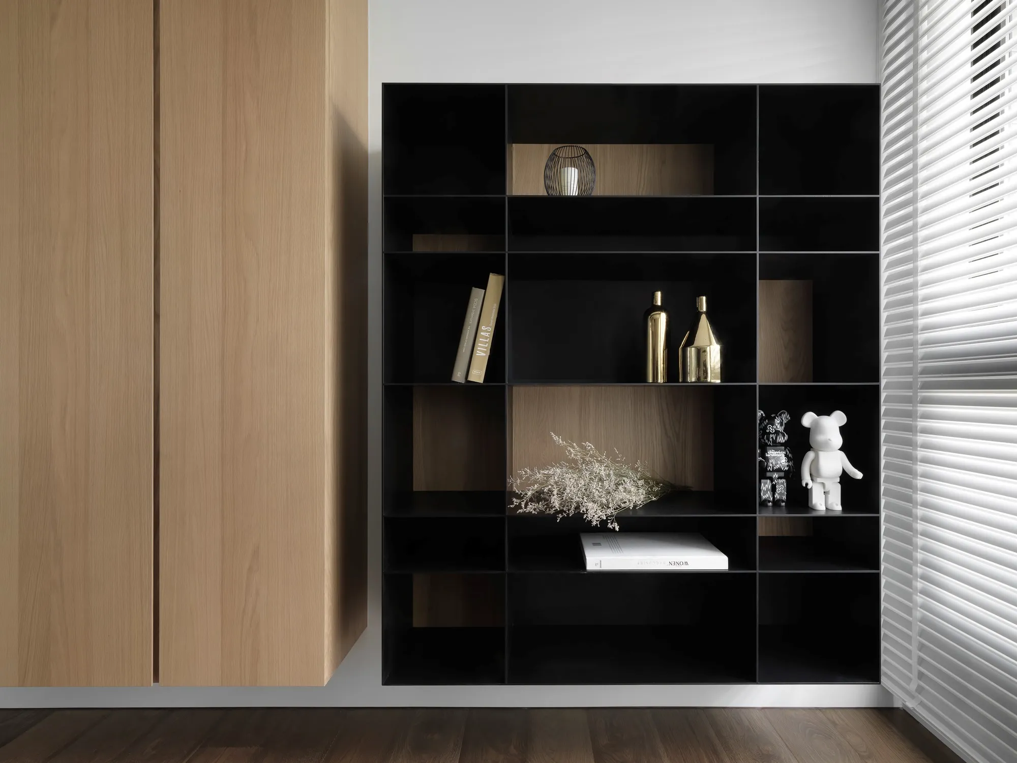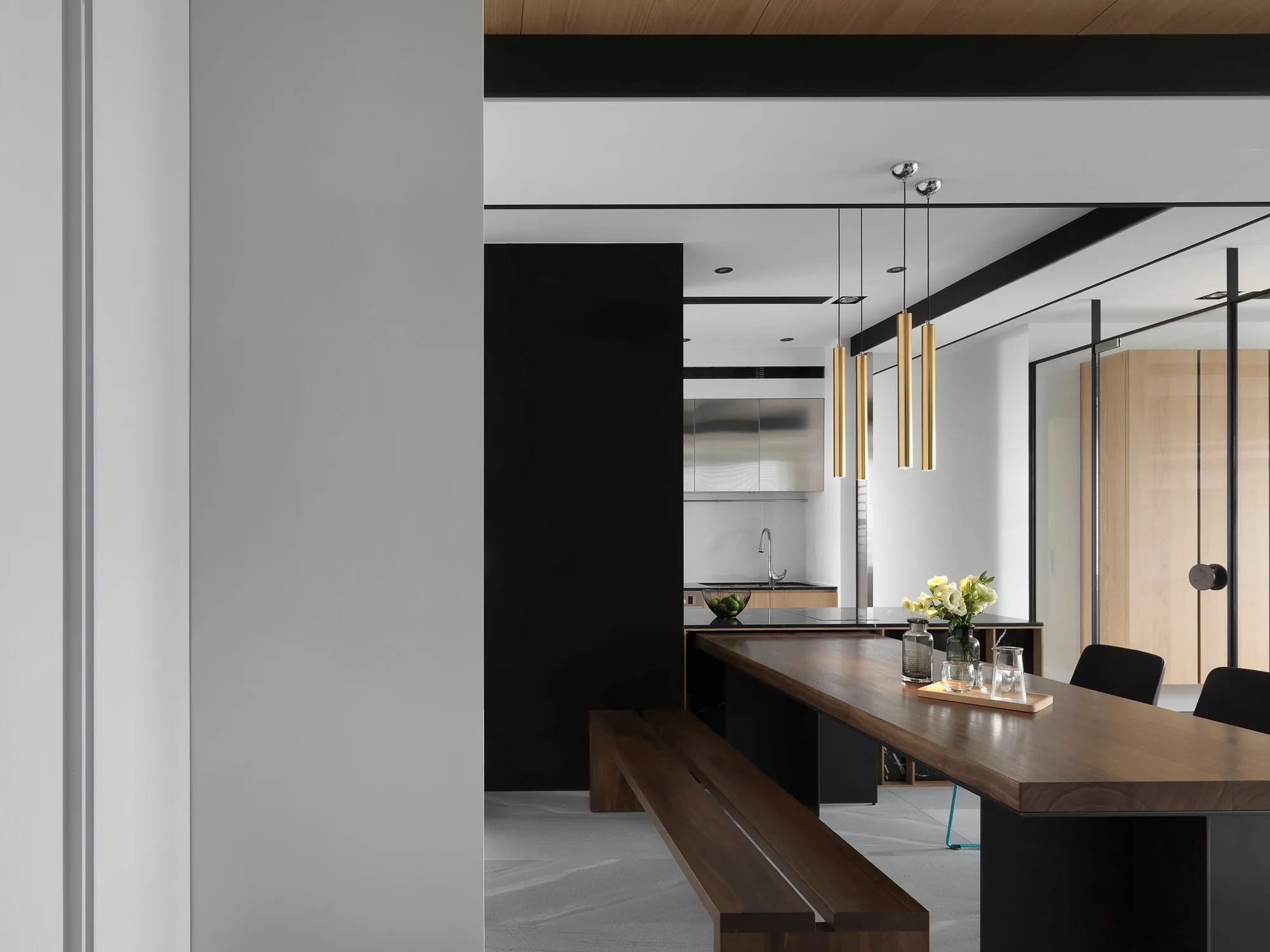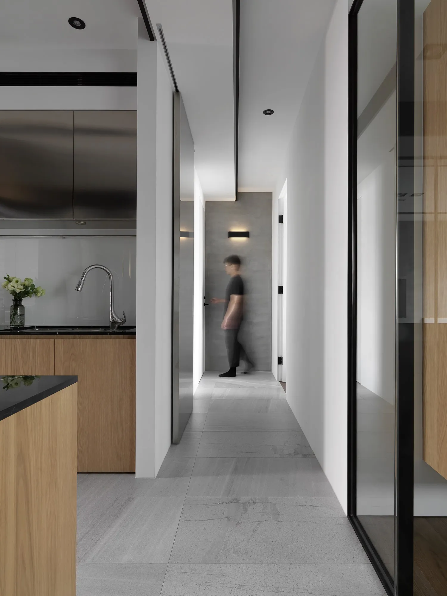 With the advantage of ample natural lighting from large windows, the designer chose to partially open the partition wall between the study and kitchen, allowing daylight to gradually extend into every corner of the space. Originally a newly completed residence, the space was redefined by removing selective walls and laying new engineered solid wood flooring. This transformation allows natural light to gently permeate the interior, while the colorless base, along with material textures and patterns, brings the space back to its essential form.In terms of color palette, the homeowner preferred a calm and refined visual tone, while also valuing the fluid connection between rooms. The final design showcases a style that is both minimal and characterful. The layout emphasizes the continuous expansion of interior space, subtly dissolving the boundaries between different areas. Through clever design techniques, the interplay between “solid” and “void” redefines spatial limits, creating unexpected transitions between zones. The designer also responded to the client’s need for exceptional storage by creatively concealing ample storage within various corners of the home using thoughtful material and color choices.This clean and simple design language creates an authentic and grounded atmosphere, inviting the residents to comfortably dwell in the space for extended periods. The soft natural tones of the wood stand out amidst the black, white, and grey base, echoing the original charm of nature. With the addition of carefully placed lighting and furniture, the spatial layering is elevated to another level.To further unify the public spaces, the partition wall between the kitchen and study was removed—not only to enhance the ease of movement between zones, but also to open up the space and allow sunlight from the large windows in the living room and study to reach the originally enclosed kitchen area. This thoughtful approach brought both functionality and surprise to the homeowners.Floor materials are used to define spatial attributes: Italian porcelain tiles lead from the entrance to the private areas, while engineered wood flooring connects the living room to the study. Glass partitions on both sides of the study clearly mark spatial boundaries while still preserving a sense of openness, offering residents a personal corner for relaxation and ease.Adjacent to the building is a lush park, imbuing the home with a leisurely, tranquil atmosphere. The indoor balcony not only enhances the amount of natural light but also adds a relaxed rhythm to the space, allowing the residents to embrace a slow-paced lifestyle indoors.The overall palette features neutral tones with touches of light wood veneer. The white walls and matte lacquered cabinetry complement the warmth of the natural wood grain, offering a clean and tidy visual impression. The TV feature wall is finished with light grey fair-faced concrete paint, while the public area flooring uses light grey Italian tiles to highlight functionality and serve as a mediator for color harmony. Dark-toned iron accents are employed to outline the contours of objects, enhancing the depth and three-dimensionality of the space and lending a strong yet simple sense of volume.Furniture is carefully selected to be both minimal and expressive, maintaining the spatial atmosphere while showcasing their distinct character, allowing design and objects to complement each other. Lighting is applied strategically with focus lighting scattered throughout the space. Care is taken not to interrupt the natural spread of sunlight, aiming instead for a harmonious blend of natural and artificial light. The space is unified through a black-white-grey achromatic scheme, resulting in a cohesive and refined aesthetic.