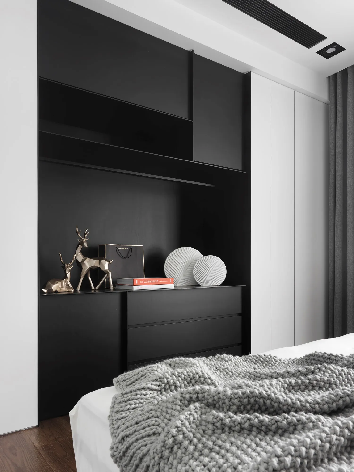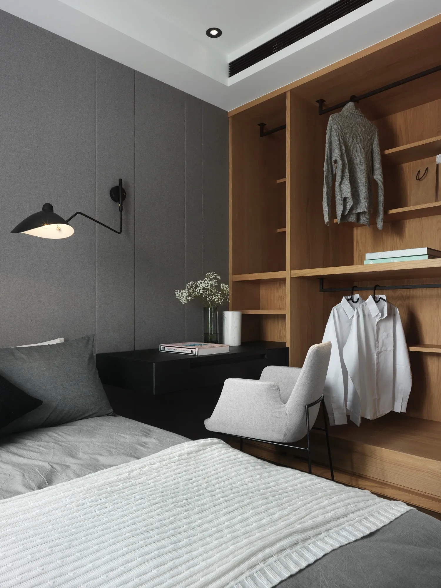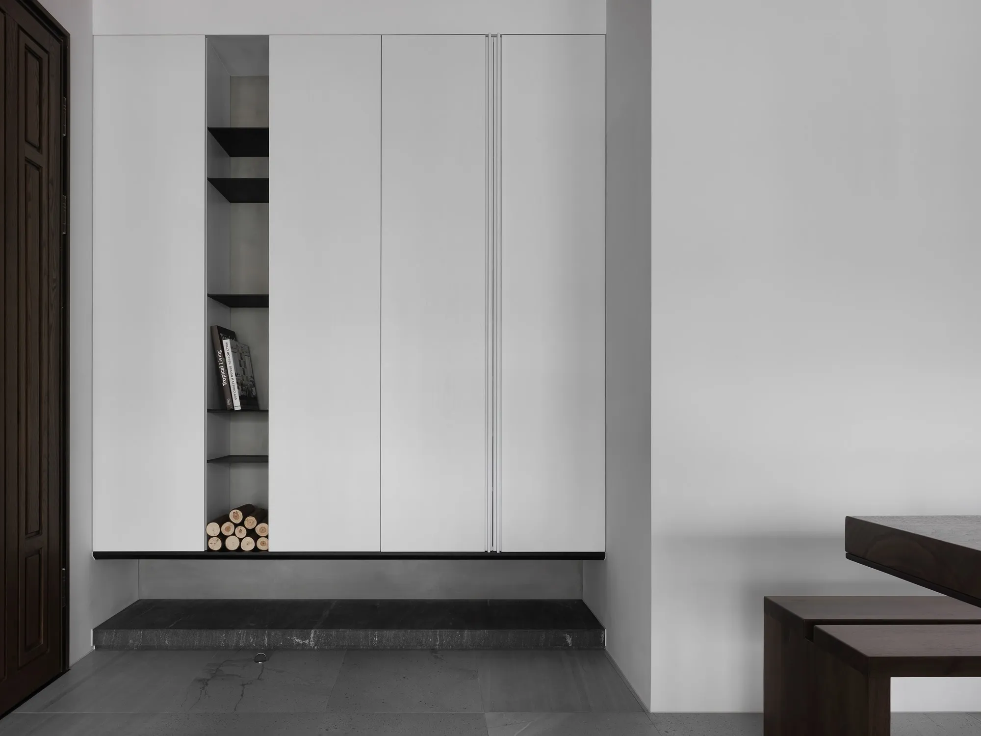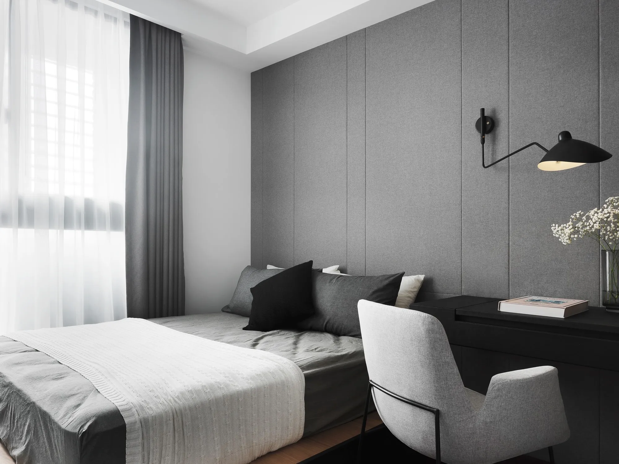 With the advantage of ample natural lighting from large windows, the designer chose to partially open the partition wall between the study and kitchen, allowing daylight to gradually extend into every corner of the space. Originally a newly completed residence, the space was redefined by removing selective walls and laying new engineered solid wood flooring. This transformation allows natural light to gently permeate the interior, while the colorless base, along with material textures and patterns, brings the space back to its essential form.In terms of color palette, the homeowner preferred a calm and refined visual tone, while also valuing the fluid connection between rooms. The final design showcases a style that is both minimal and characterful. The layout emphasizes the continuous expansion of interior space, subtly dissolving the boundaries between different areas. Through clever design techniques, the interplay between “solid” and “void” redefines spatial limits, creating unexpected transitions between zones. The designer also responded to the client’s need for exceptional storage by creatively concealing ample storage within various corners of the home using thoughtful material and color choices.This clean and simple design language creates an authentic and grounded atmosphere, inviting the residents to comfortably dwell in the space for extended periods. The soft natural tones of the wood stand out amidst the black, white, and grey base, echoing the original charm of nature. With the addition of carefully placed lighting and furniture, the spatial layering is elevated to another level.To further unify the public spaces, the partition wall between the kitchen and study was removed—not only to enhance the ease of movement between zones, but also to open up the space and allow sunlight from the large windows in the living room and study to reach the originally enclosed kitchen area. This thoughtful approach brought both functionality and surprise to the homeowners.Floor materials are used to define spatial attributes: Italian porcelain tiles lead from the entrance to the private areas, while engineered wood flooring connects the living room to the study. Glass partitions on both sides of the study clearly mark spatial boundaries while still preserving a sense of openness, offering residents a personal corner for relaxation and ease.Adjacent to the building is a lush park, imbuing the home with a leisurely, tranquil atmosphere. The indoor balcony not only enhances the amount of natural light but also adds a relaxed rhythm to the space, allowing the residents to embrace a slow-paced lifestyle indoors.The overall palette features neutral tones with touches of light wood veneer. The white walls and matte lacquered cabinetry complement the warmth of the natural wood grain, offering a clean and tidy visual impression. The TV feature wall is finished with light grey fair-faced concrete paint, while the public area flooring uses light grey Italian tiles to highlight functionality and serve as a mediator for color harmony. Dark-toned iron accents are employed to outline the contours of objects, enhancing the depth and three-dimensionality of the space and lending a strong yet simple sense of volume.Furniture is carefully selected to be both minimal and expressive, maintaining the spatial atmosphere while showcasing their distinct character, allowing design and objects to complement each other. Lighting is applied strategically with focus lighting scattered throughout the space. Care is taken not to interrupt the natural spread of sunlight, aiming instead for a harmonious blend of natural and artificial light. The space is unified through a black-white-grey achromatic scheme, resulting in a cohesive and refined aesthetic.