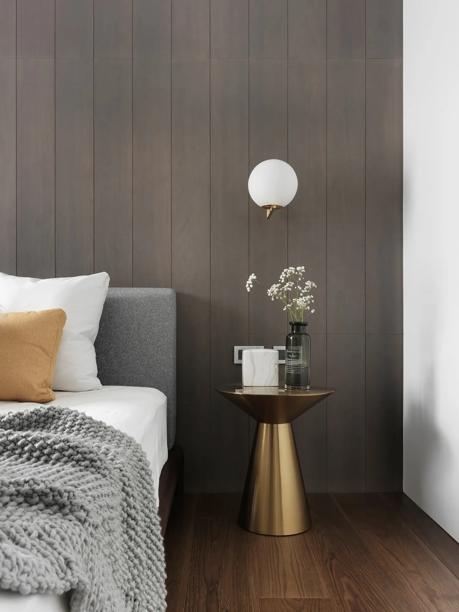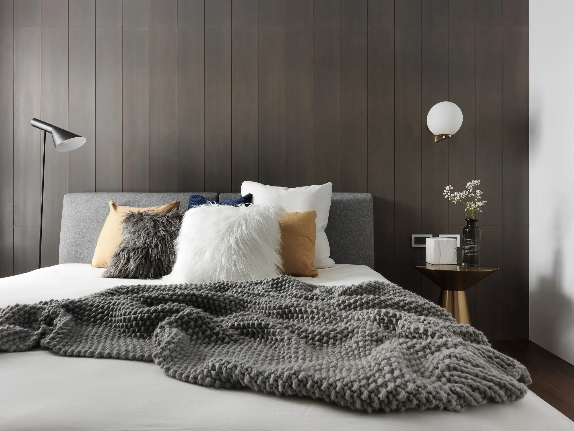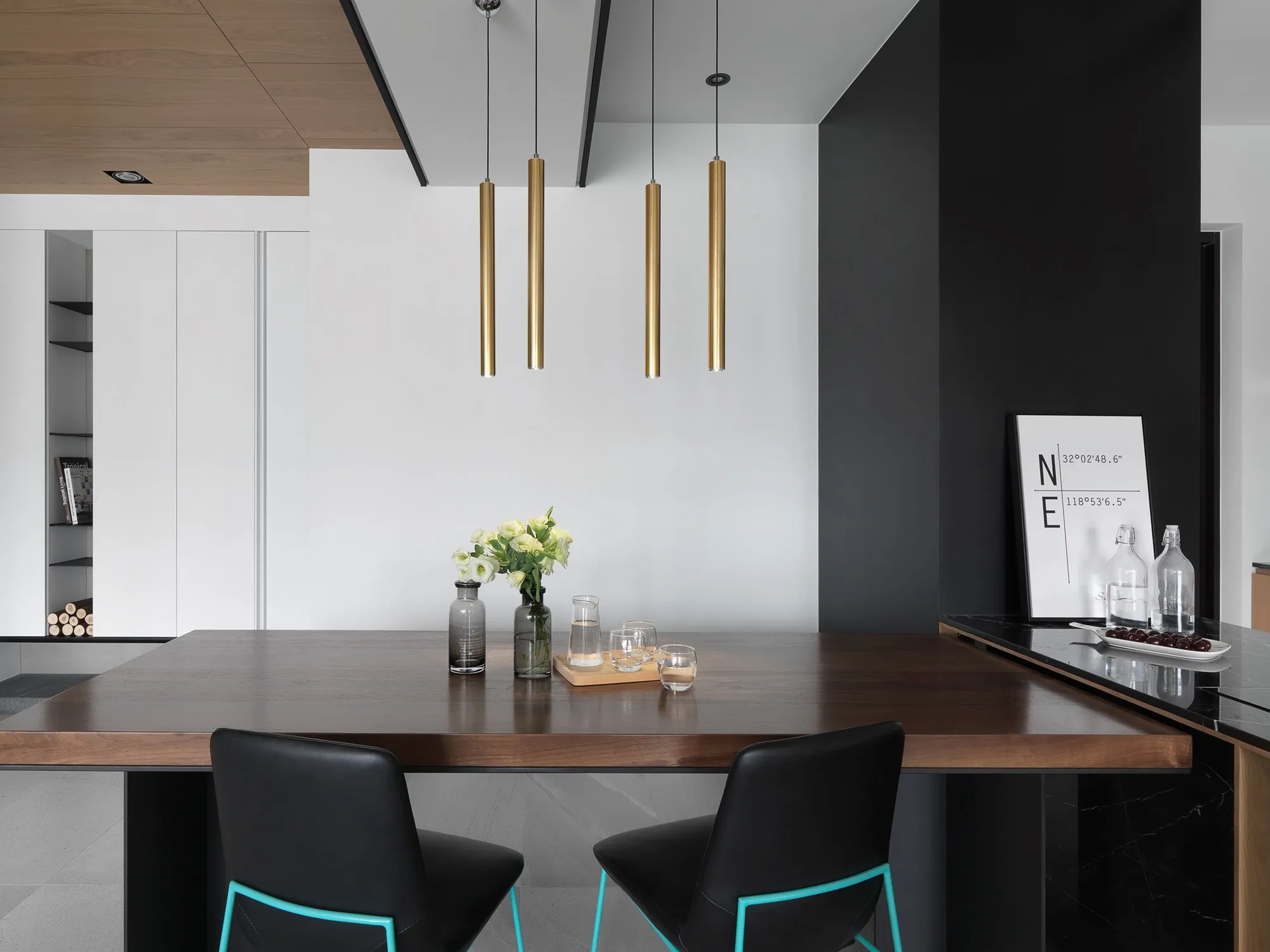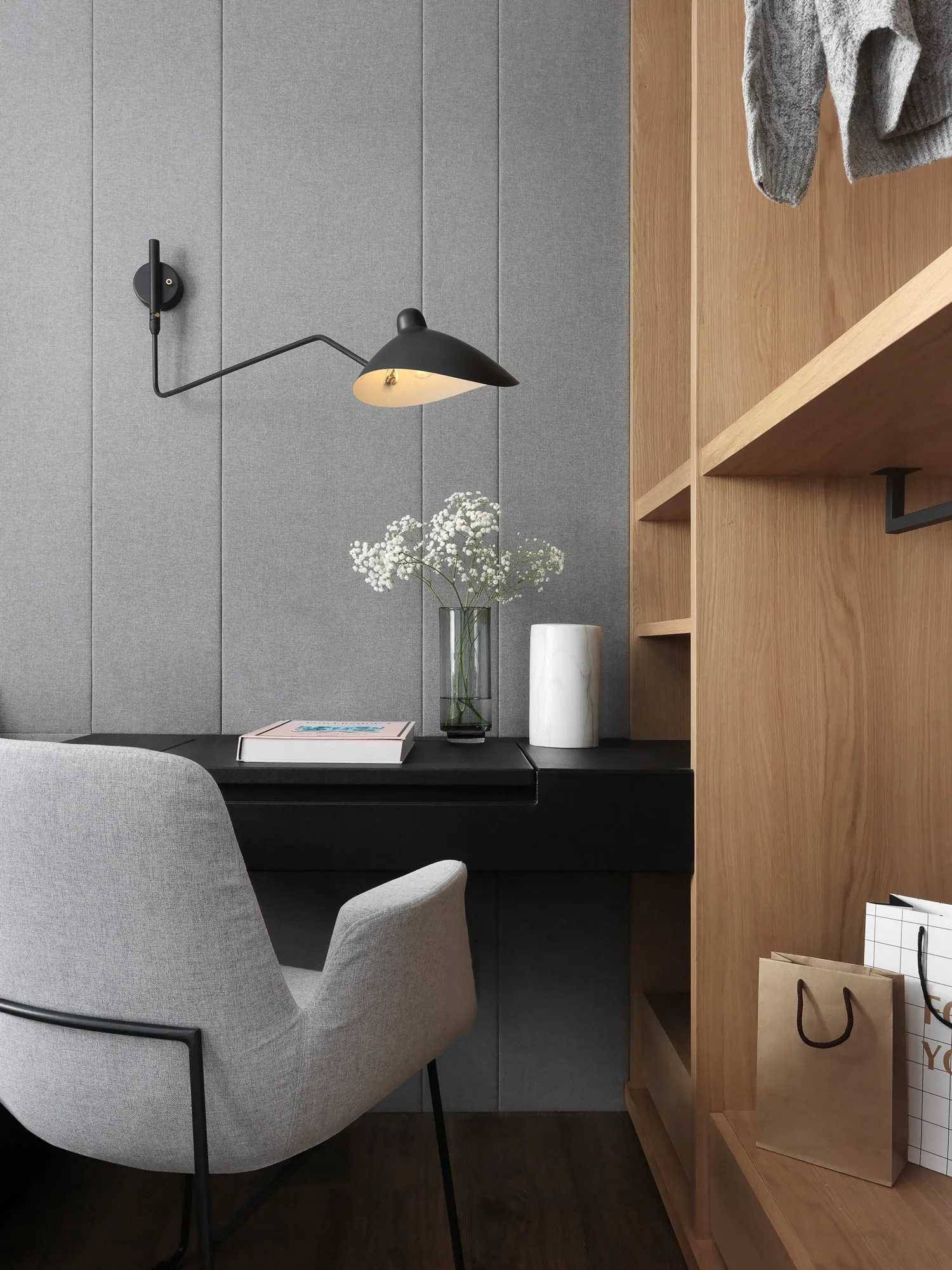 With the advantage of ample natural lighting from large windows, the designer chose to partially open the partition wall between the study and kitchen, allowing daylight to gradually extend into every corner of the space. Originally a newly completed residence, the space was redefined by removing selective walls and laying new engineered solid wood flooring. This transformation allows natural light to gently permeate the interior, while the colorless base, along with material textures and patterns, brings the space back to its essential form.In terms of color palette, the homeowner preferred a calm and refined visual tone, while also valuing the fluid connection between rooms. The final design showcases a style that is both minimal and characterful. The layout emphasizes the continuous expansion of interior space, subtly dissolving the boundaries between different areas. Through clever design techniques, the interplay between “solid” and “void” redefines spatial limits, creating unexpected transitions between zones. The designer also responded to the client’s need for exceptional storage by creatively concealing ample storage within various corners of the home using thoughtful material and color choices.This clean and simple design language creates an authentic and grounded atmosphere, inviting the residents to comfortably dwell in the space for extended periods. The soft natural tones of the wood stand out amidst the black, white, and grey base, echoing the original charm of nature. With the addition of carefully placed lighting and furniture, the spatial layering is elevated to another level.To further unify the public spaces, the partition wall between the kitchen and study was removed—not only to enhance the ease of movement between zones, but also to open up the space and allow sunlight from the large windows in the living room and study to reach the originally enclosed kitchen area. This thoughtful approach brought both functionality and surprise to the homeowners.Floor materials are used to define spatial attributes: Italian porcelain tiles lead from the entrance to the private areas, while engineered wood flooring connects the living room to the study. Glass partitions on both sides of the study clearly mark spatial boundaries while still preserving a sense of openness, offering residents a personal corner for relaxation and ease.Adjacent to the building is a lush park, imbuing the home with a leisurely, tranquil atmosphere. The indoor balcony not only enhances the amount of natural light but also adds a relaxed rhythm to the space, allowing the residents to embrace a slow-paced lifestyle indoors.The overall palette features neutral tones with touches of light wood veneer. The white walls and matte lacquered cabinetry complement the warmth of the natural wood grain, offering a clean and tidy visual impression. The TV feature wall is finished with light grey fair-faced concrete paint, while the public area flooring uses light grey Italian tiles to highlight functionality and serve as a mediator for color harmony. Dark-toned iron accents are employed to outline the contours of objects, enhancing the depth and three-dimensionality of the space and lending a strong yet simple sense of volume.Furniture is carefully selected to be both minimal and expressive, maintaining the spatial atmosphere while showcasing their distinct character, allowing design and objects to complement each other. Lighting is applied strategically with focus lighting scattered throughout the space. Care is taken not to interrupt the natural spread of sunlight, aiming instead for a harmonious blend of natural and artificial light. The space is unified through a black-white-grey achromatic scheme, resulting in a cohesive and refined aesthetic.