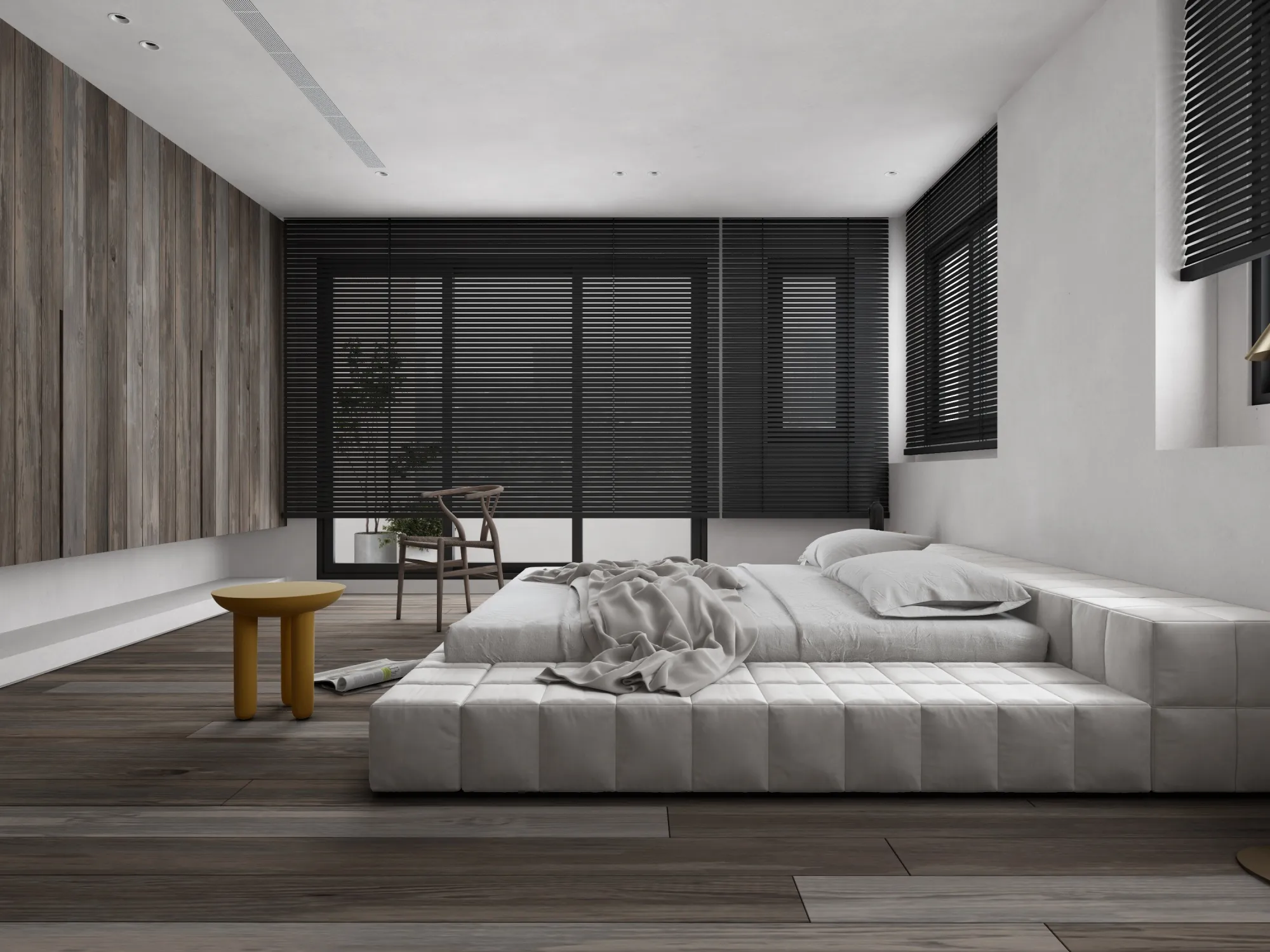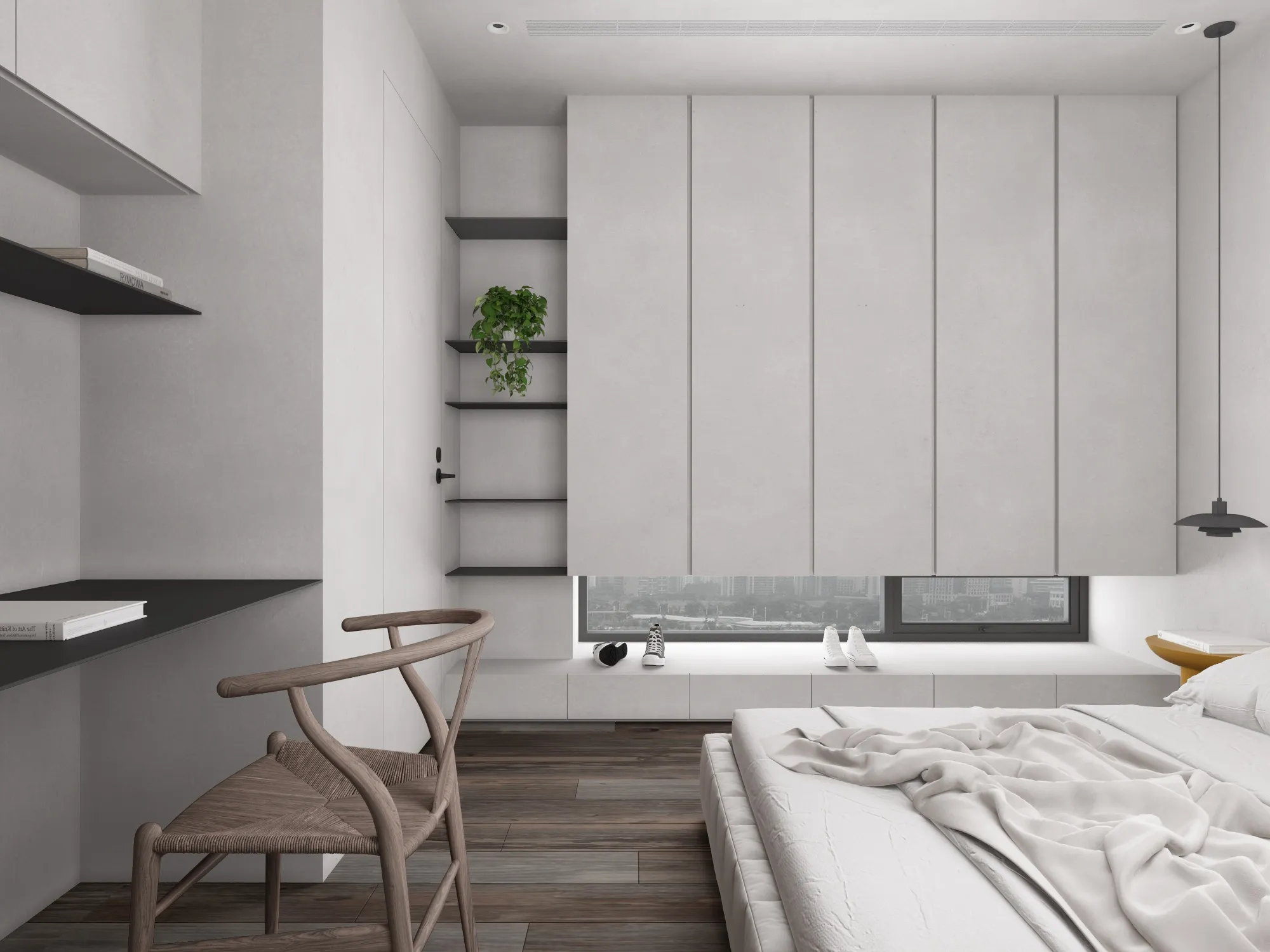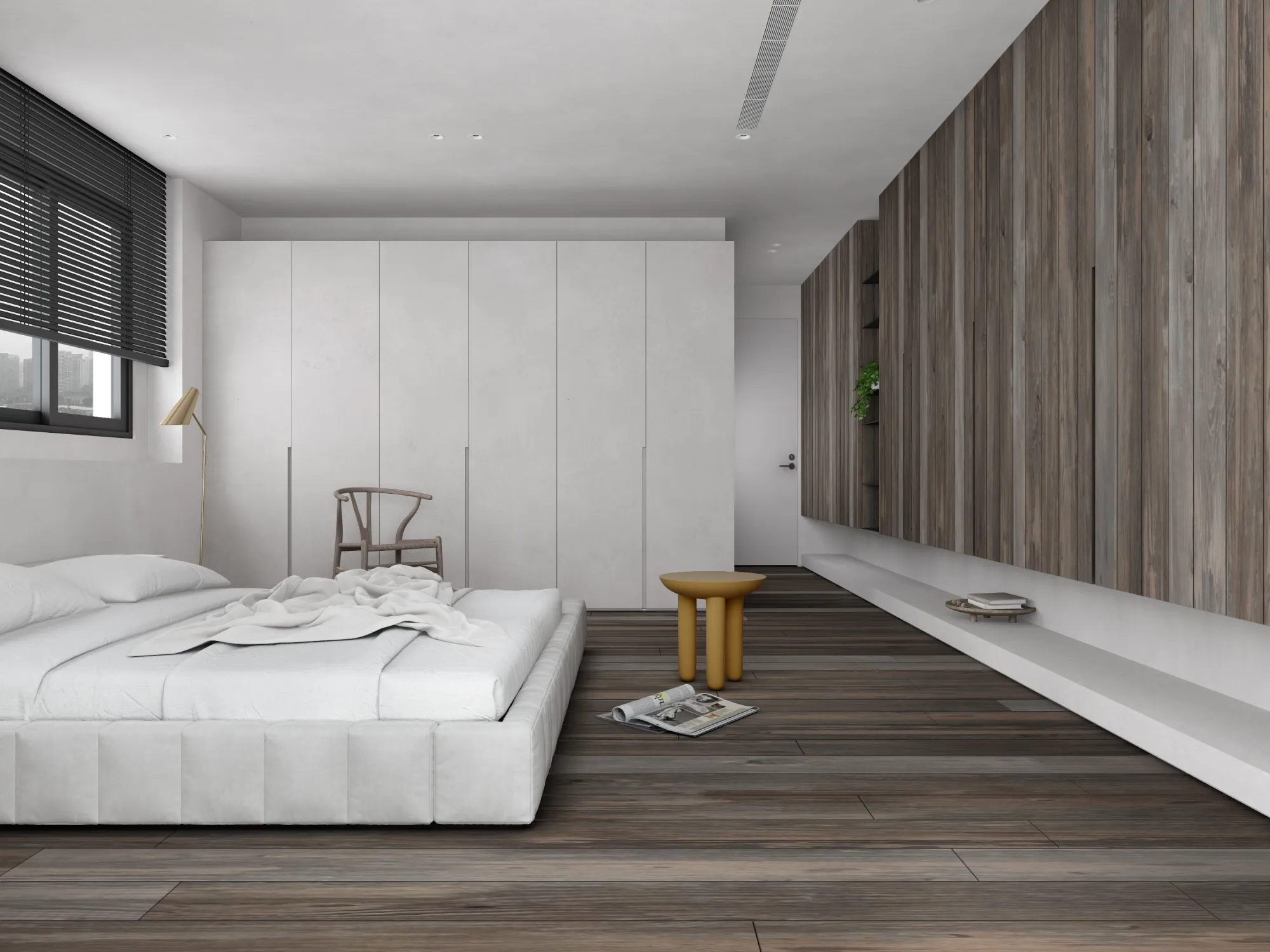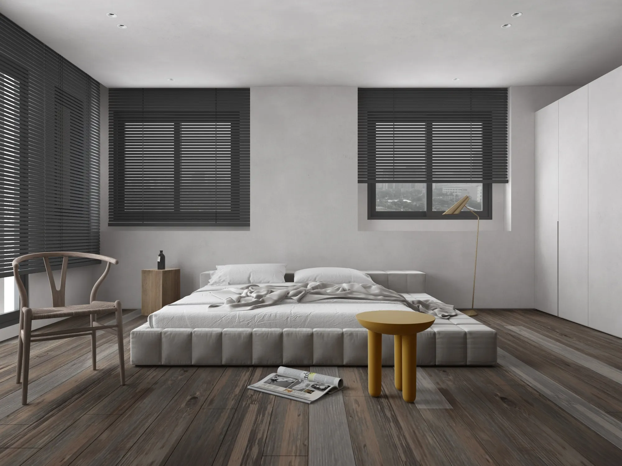 In a minimalist space, we redefine the poetry of living.This is a softly spoken, tranquil bedroom where muted grey tones form the base, allowing light and shadow to move freely and gracefully throughout. Expansive white walls pair with warm wooden flooring to gently unfold a quiet sense of warmth. The dialogue between clean-lined furniture and refined materials creates a visual rhythm of calm and purity. Wide windows dressed in dark blinds frame the cityscape like moving paintings, keeping the urban tempo outside while preserving only soft, natural light and a moment of stillness within. The bed rests low to the ground, gently aligning with the pace of daily life. Nearby, a brass floor lamp, a wooden chair, and a mustard-hued round side table bring layered texture and warmth to the room. Every space should be like a book of poetry—quietly holding the stories and emotions of those who dwell within. Design, then, is the language that lets us read it with ease and comfort. A home is not merely a structure, but a sanctuary for the soul.