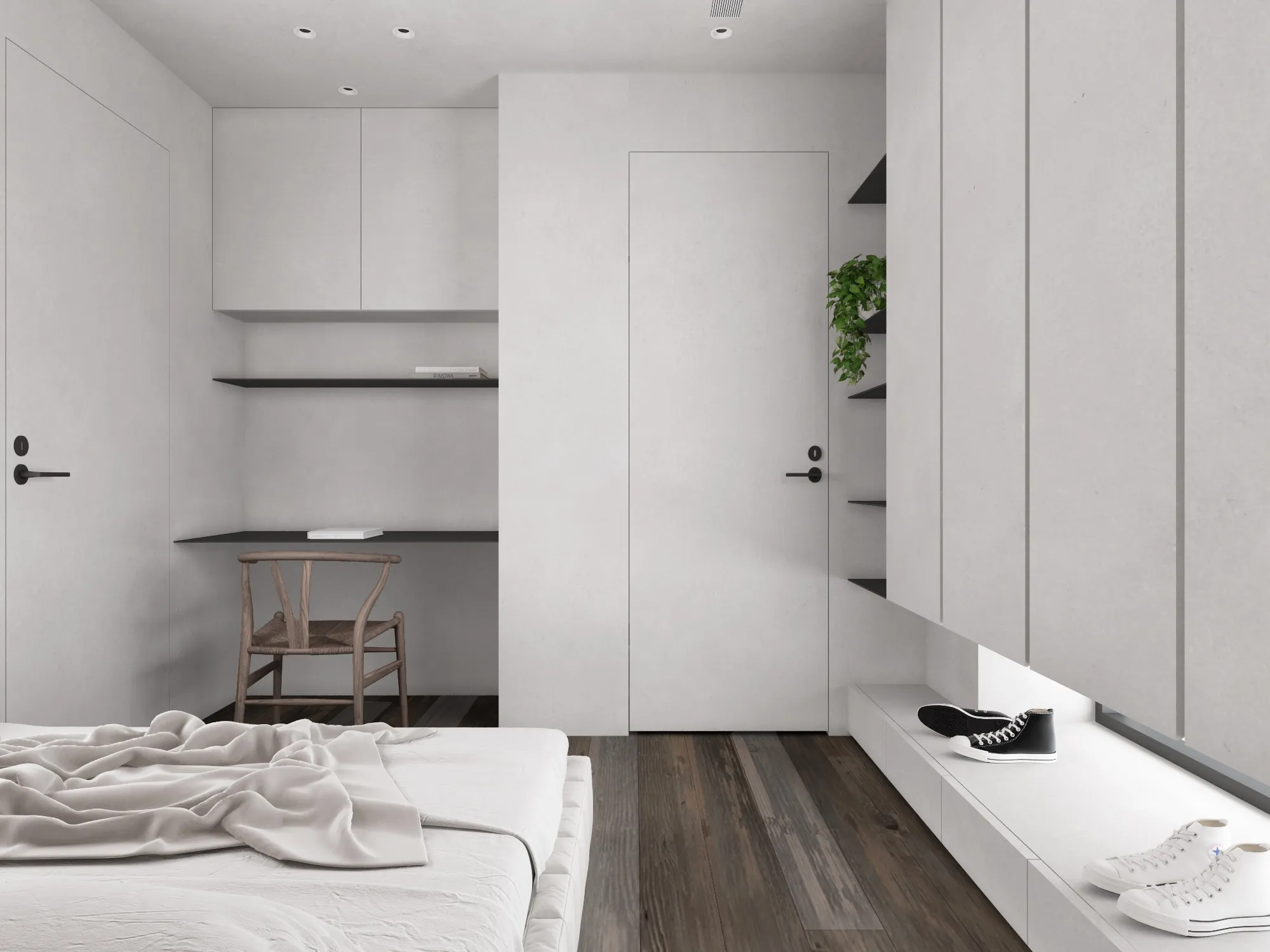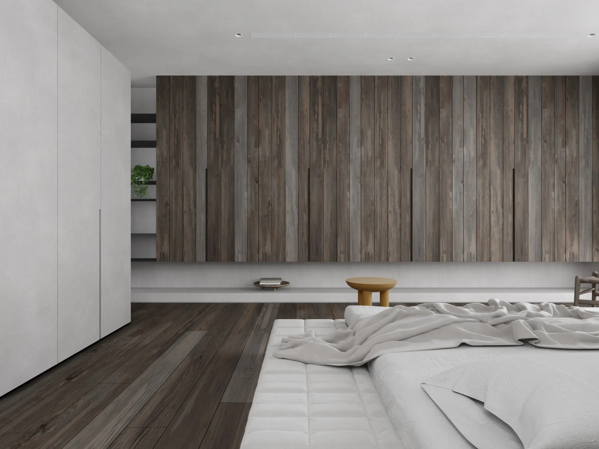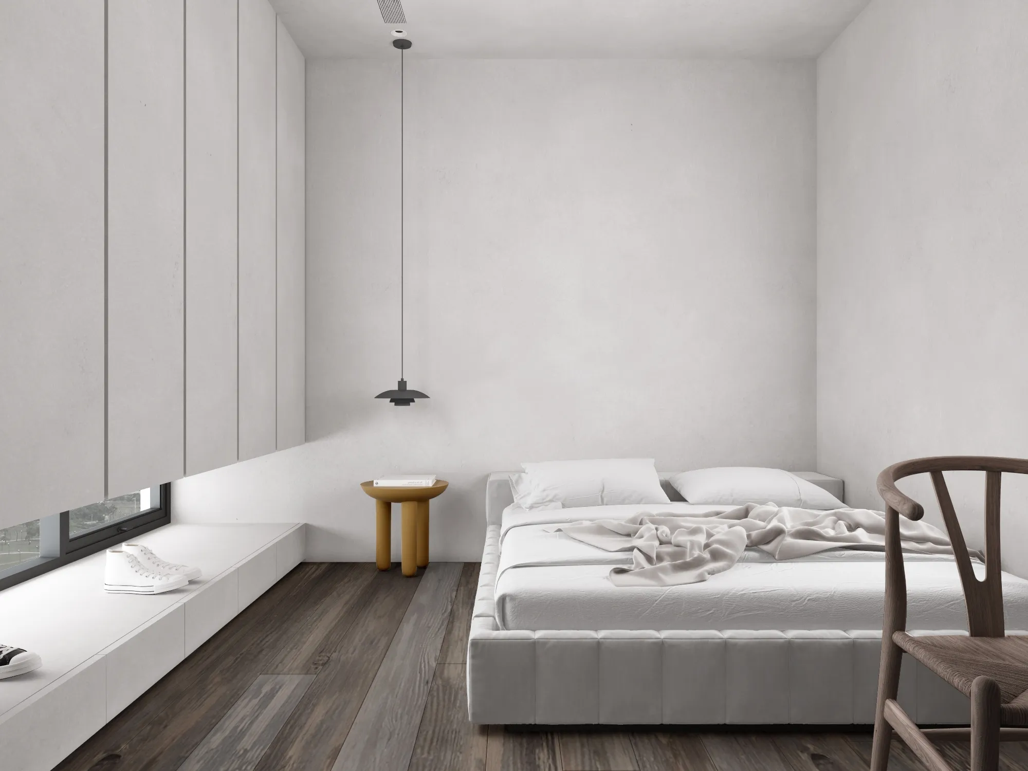 In a minimalist space, we redefine the poetry of living.This is a softly spoken, tranquil bedroom where muted grey tones form the base, allowing light and shadow to move freely and gracefully throughout. Expansive white walls pair with warm wooden flooring to gently unfold a quiet sense of warmth. The dialogue between clean-lined furniture and refined materials creates a visual rhythm of calm and purity. Wide windows dressed in dark blinds frame the cityscape like moving paintings, keeping the urban tempo outside while preserving only soft, natural light and a moment of stillness within. The bed rests low to the ground, gently aligning with the pace of daily life. Nearby, a brass floor lamp, a wooden chair, and a mustard-hued round side table bring layered texture and warmth to the room. Every space should be like a book of poetry—quietly holding the stories and emotions of those who dwell within. Design, then, is the language that lets us read it with ease and comfort. A home is not merely a structure, but a sanctuary for the soul.