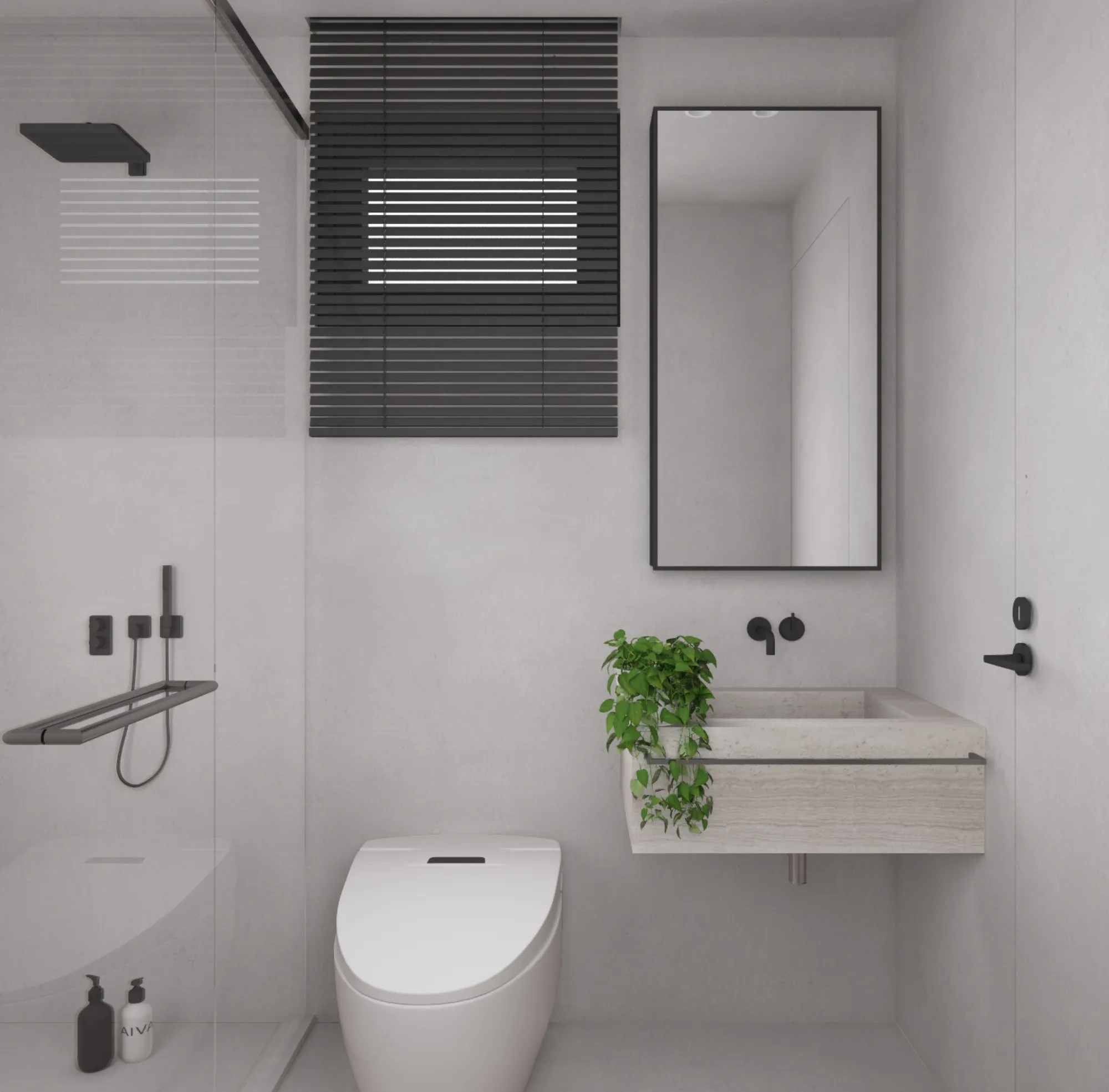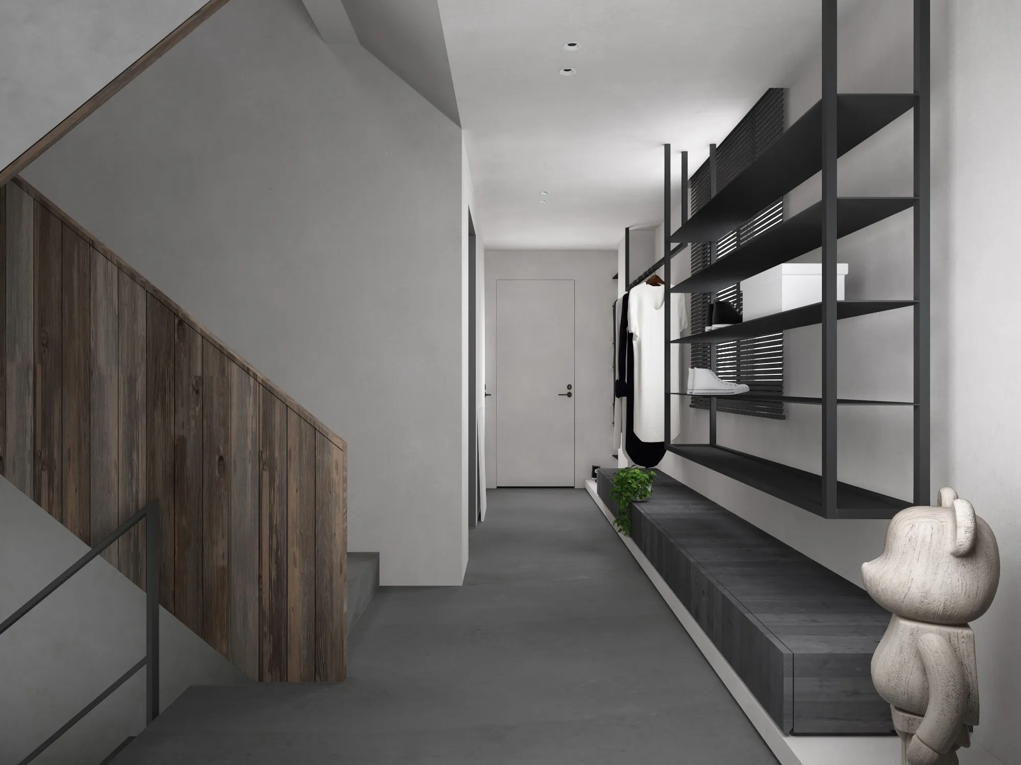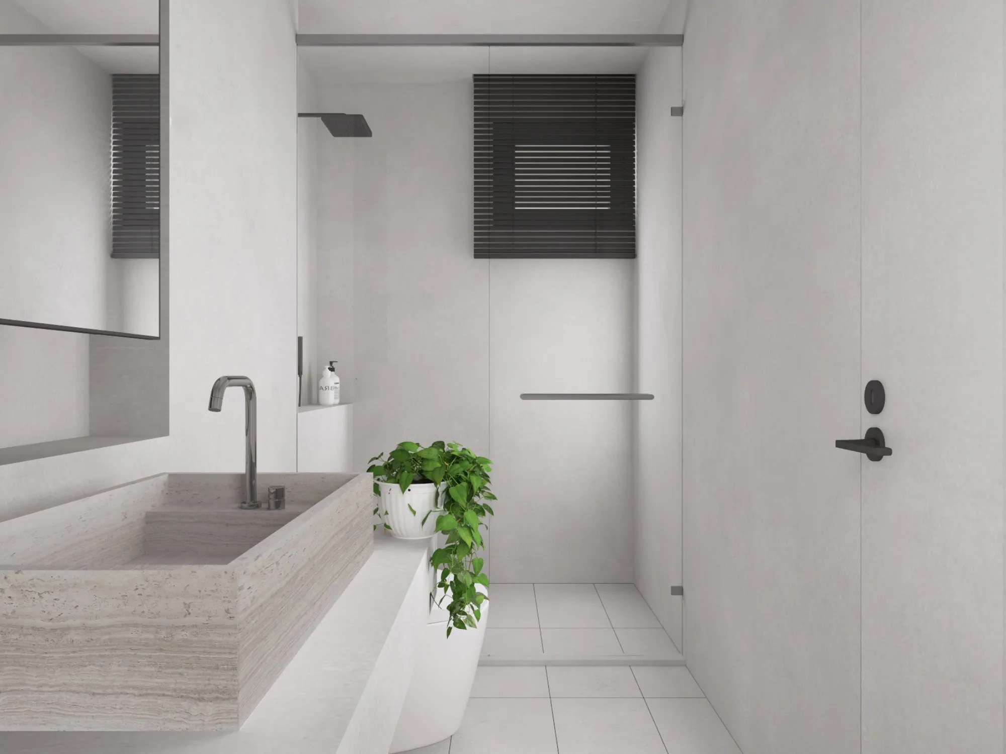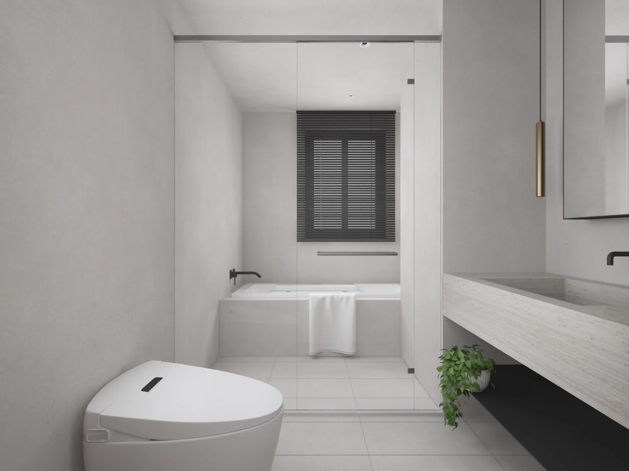 In a minimalist space, we redefine the poetry of living.This is a softly spoken, tranquil bedroom where muted grey tones form the base, allowing light and shadow to move freely and gracefully throughout. Expansive white walls pair with warm wooden flooring to gently unfold a quiet sense of warmth. The dialogue between clean-lined furniture and refined materials creates a visual rhythm of calm and purity. Wide windows dressed in dark blinds frame the cityscape like moving paintings, keeping the urban tempo outside while preserving only soft, natural light and a moment of stillness within. The bed rests low to the ground, gently aligning with the pace of daily life. Nearby, a brass floor lamp, a wooden chair, and a mustard-hued round side table bring layered texture and warmth to the room. Every space should be like a book of poetry—quietly holding the stories and emotions of those who dwell within. Design, then, is the language that lets us read it with ease and comfort. A home is not merely a structure, but a sanctuary for the soul.