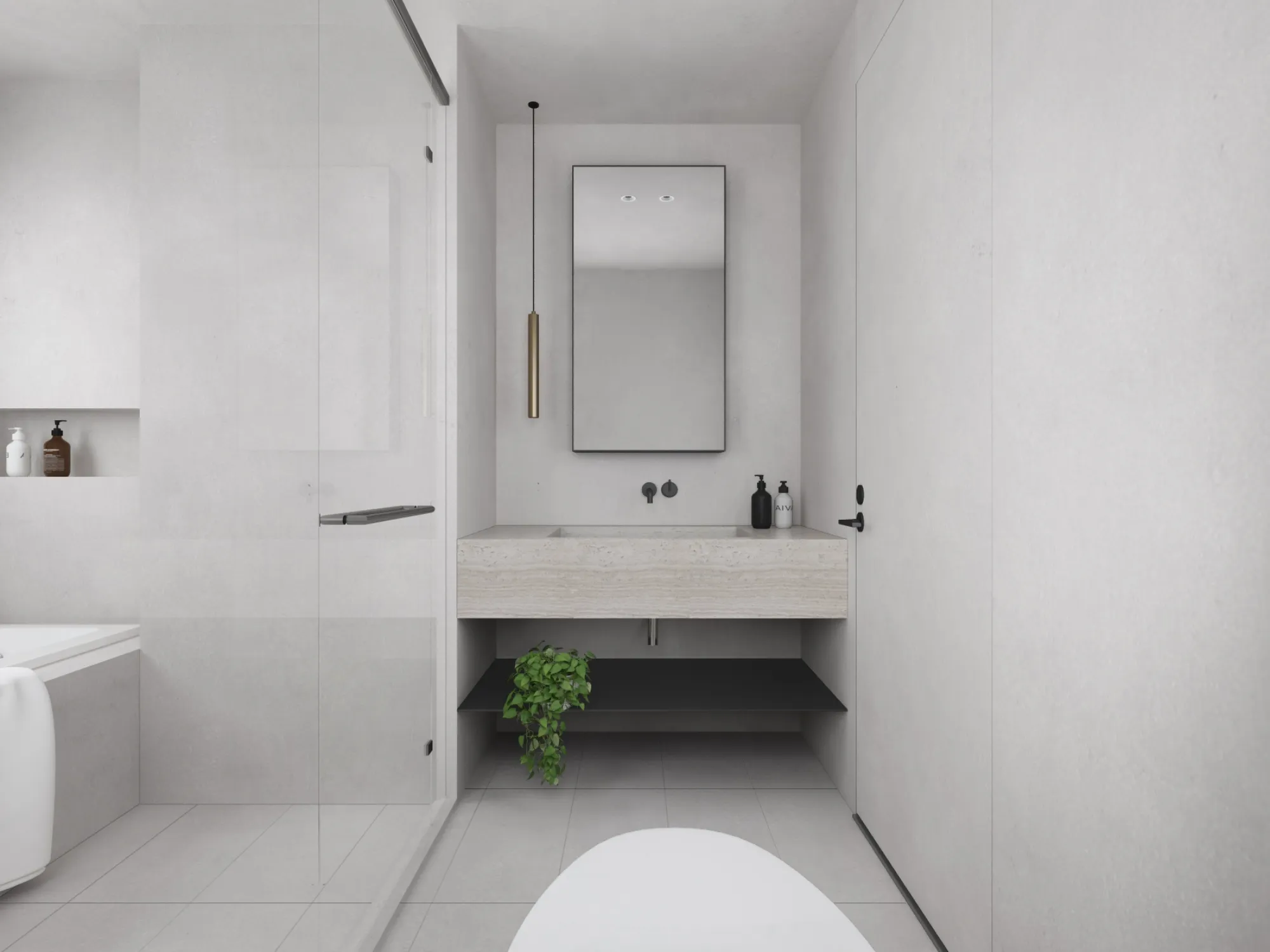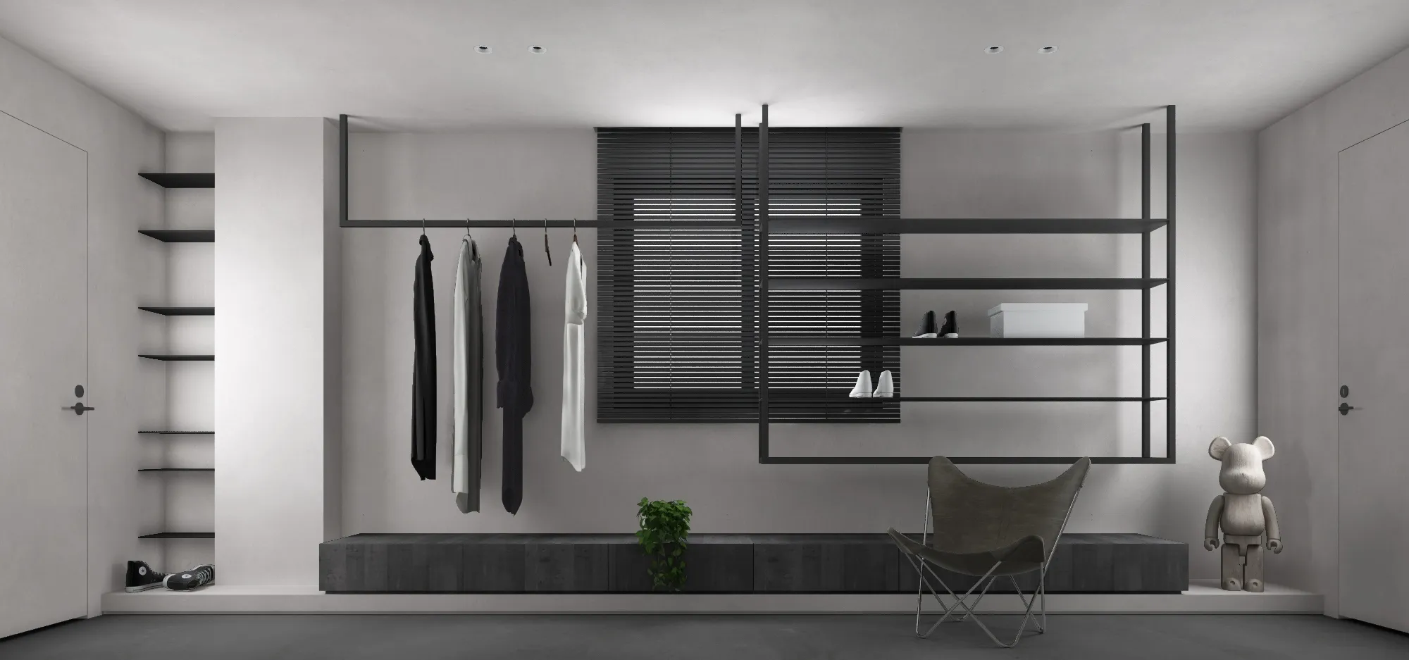 在極簡空間中,我們重新定義了「居住」的詩意。這是一個低語般安靜的臥室空間,選擇了柔霧灰作為基調,讓光與影在其中流動得更自在。大片的留白牆面搭配溫潤木質地坪,輕輕鋪展出一種不言而喻的溫度;而極簡線條的家具與細膩材質的對話,則在視覺上構築出穩定與純粹的秩序感。寬幅落地窗搭配深色百葉簾,彷彿一幕幕風景畫的畫框,讓城市的節奏留在窗外,室內只保留柔和自然的光線和片刻寧靜。床鋪低躺於地面,輕輕貼近生活的節奏,周圍細節如黃銅立燈、木質單椅與黃橘圓几,巧妙點綴空間層次與溫暖度。每一個空間都該像一本詩集,隱含住者的情感與故事,而設計,正是那讓人安心翻閱的語言。讓家,不只是結構,更是靈魂的棲地。