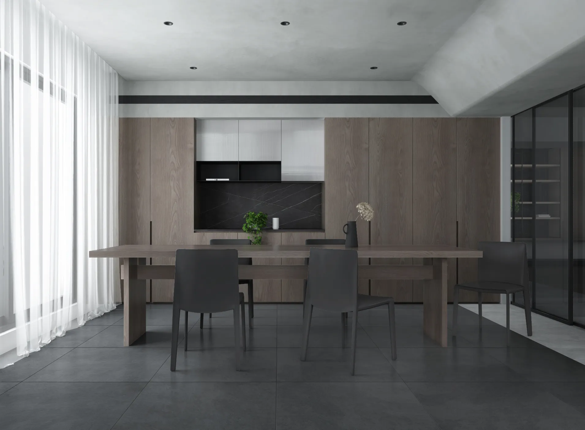 The deep but not heavy wood creates a gentlemanly and stable atmosphere;Quiet but not turbid gray, repeating the moving lines and details of life;Pure and unadulterated white becomes the best medium for light extension.