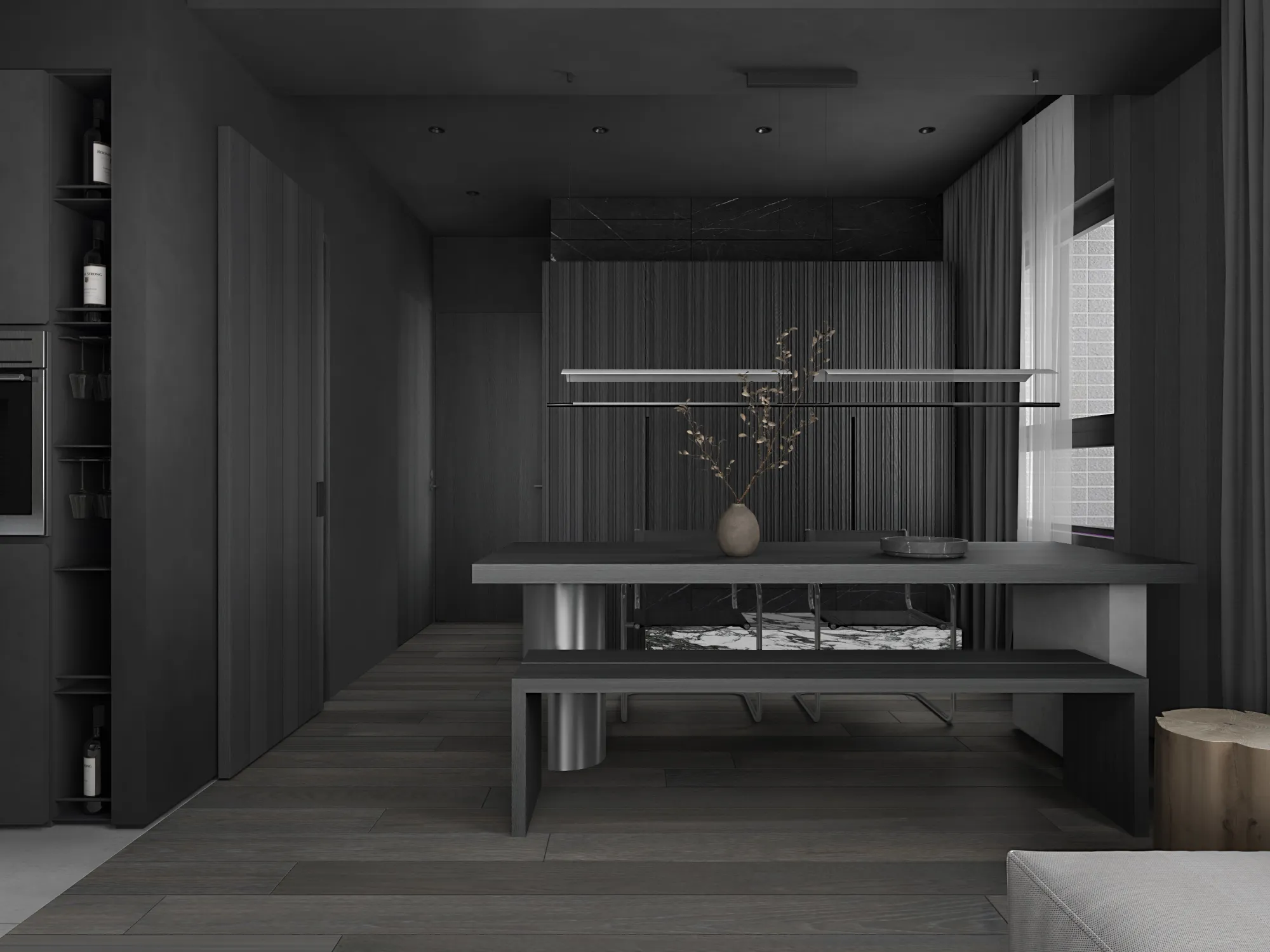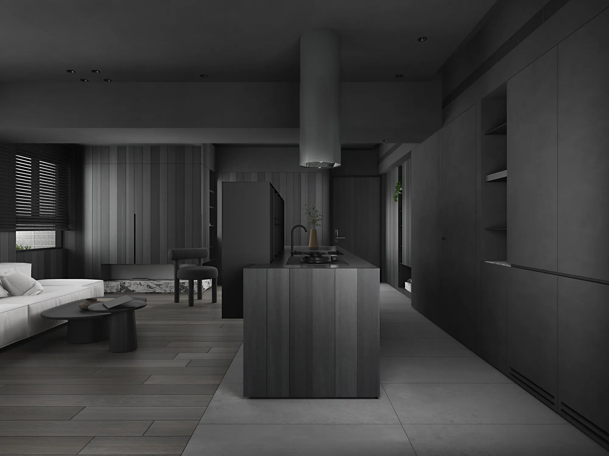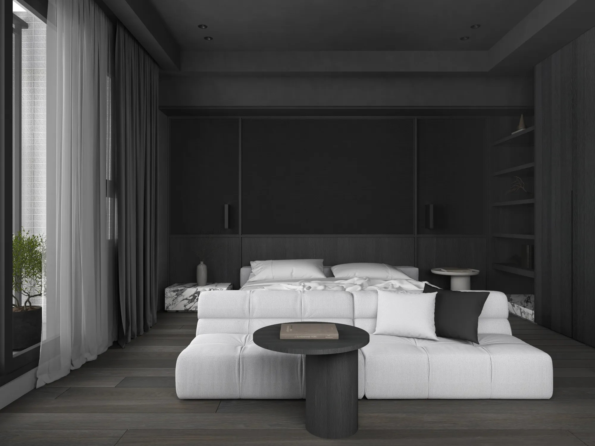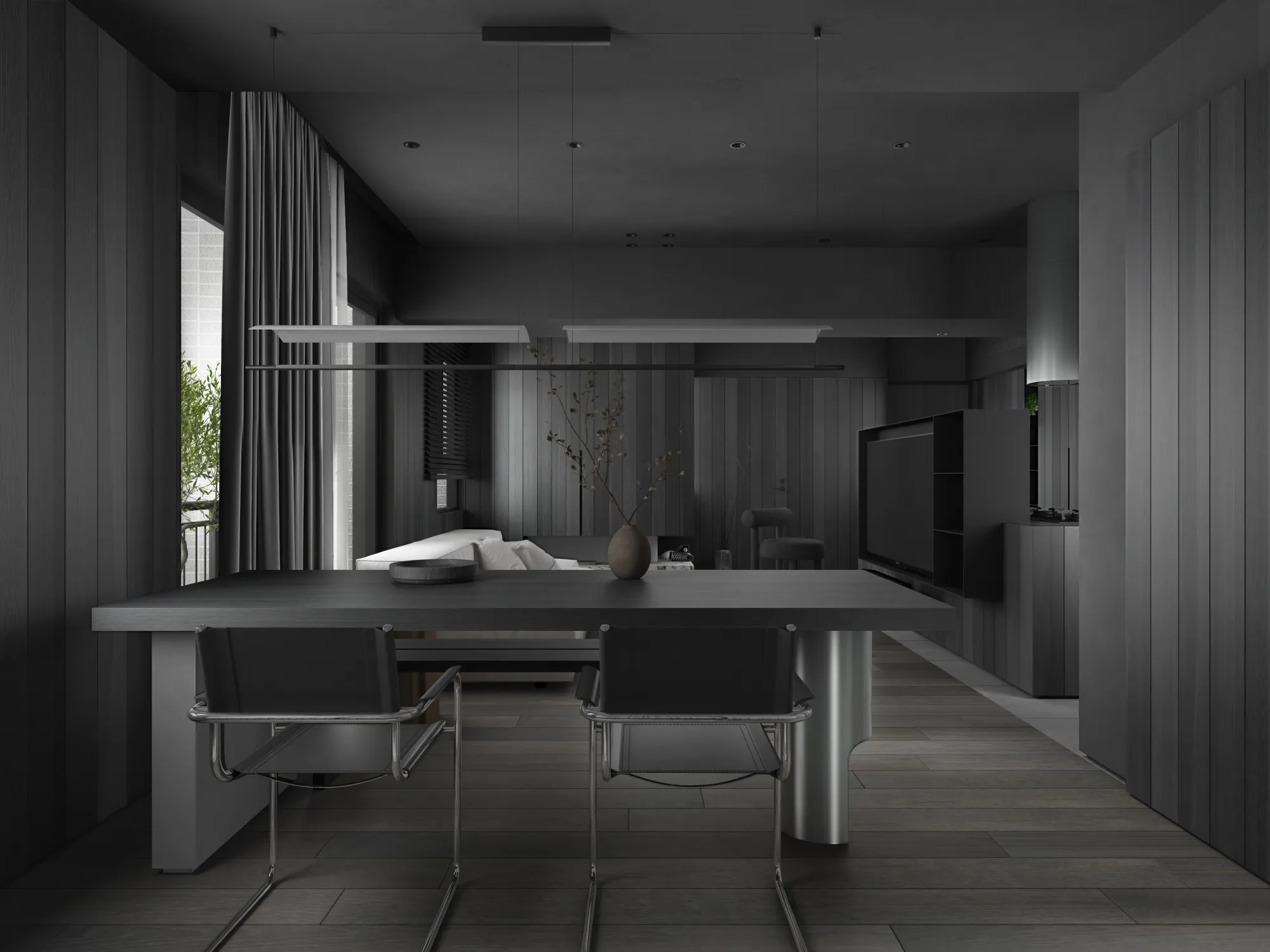 運用多元材質與無彩度構成多重層次設計,在自然過渡的動線中詮釋空間的多樣性,在看似沒有溫度的外表下,隱藏著細膩與溫暖。當不同元素與周圍的黑色互碰撞時,它們既獨立又被黑色溶解,看似被吞噬其中,卻又在一片寂靜中自成一角。黑色是光誕生的顏色,好似生活的底色,幻化成思想的形狀,無限蔓延交織成了一張柔軟靜謐的網,接住每一個疲憊的靈魂,無盡的自由打破了束縛。與悠然邂逅,以無拘無束的形式給予浪漫另一種可能。